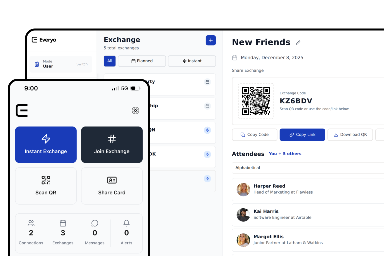 An Instant Exchange is a 1:1 connection between you and anyone — no event needed. Share it, and you're both in. AI analyzes both profiles and gives you reasons to connect.